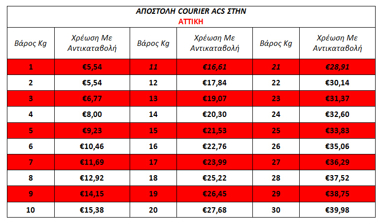 Μια συσκευήέχει βάρος 3KG αλλά η συσκευασία της έχειδιαστάσεις, (100 εκ. x 18 εκ. x 47 εκ.) (100 * 18 * 47) = 84600 -> 84600 / 5000 = 16,92 KG.Σε αυτήντην περίπτωση και σύμφωνα με τον παρακάτω πινάκα (ΑΠΟΣΤΟΛΗ ΜΕ COURIER ACS ΓΙΑ ΑΤΤΙΚΗ) η χρέωση θα είναι 23,99 € αντίγια 6,77 €..